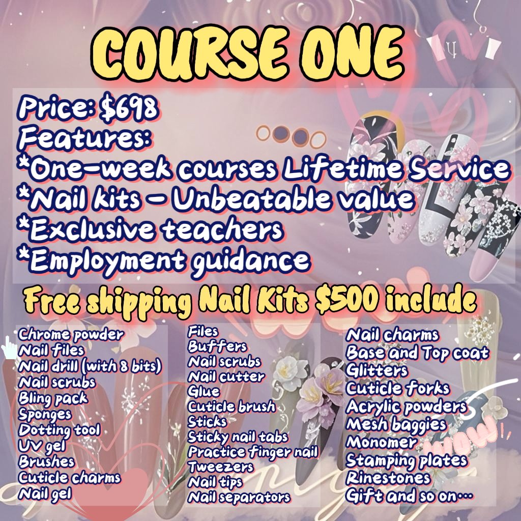 Free shipping Nail kits $150 include(Free for students) Aurora powder / Nail drill (with 8 bits) / Sponges / Brushes / Files / Nail cutter / Sticks / Tweezers / Nail charms / Cuticle fork / Mesh baggies / Stamping plates / Nail files / Nail scrubs / Dotting tool / Cuticle trims / Buffers / Glue / Sticky nail tabs / Nail tips / Base and Top coat / Acrylic powders / Monomer / Rhinestones / Bling pack / Nail gel / Nail scrubs / Cuticle brush / Practice fingernail / Nail separators / Glitters / Gift and so on!